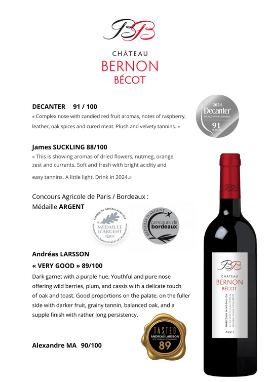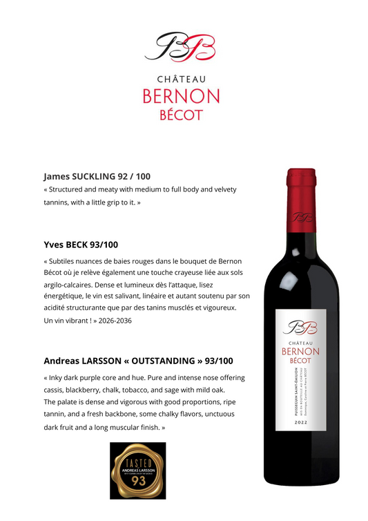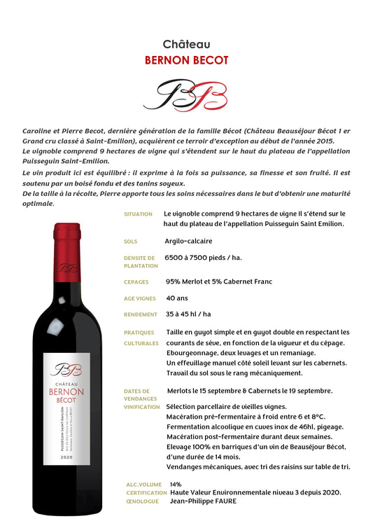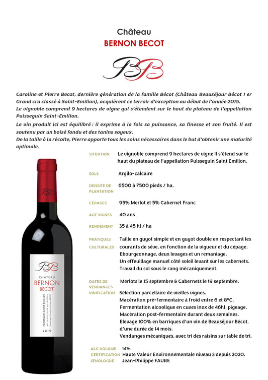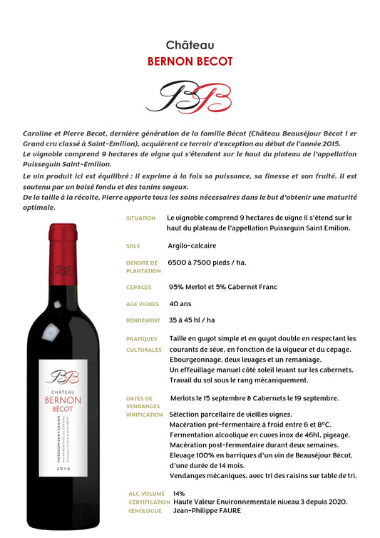 Le millésime 2016, représente pour moi ma première année, de A à Z de la vigne au chai. Nos premières vendanges au Château Bernon Bécot et donc nos premières vinifications dans notre nouveau chai. Ce millésime est exceptionnel, il se distingue à la fois par sa qualité et sa quantité. Le climat a été très favorable avec quelques chaleurs en juin, juillet mais des pluies du mois de septembre ont permis aux raisins d’atteindre une maturité parfaite. Le millésime 2016 est profond, charnu et fruité. Ses tanins sont ronds et le bois fondu.